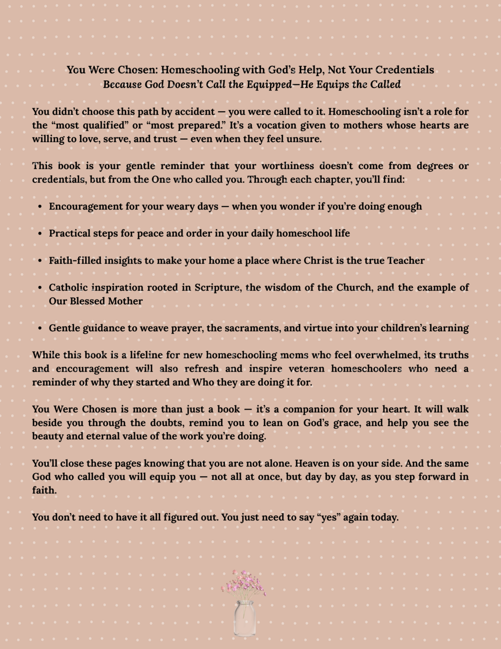 You Were Chosen: Homeschooling with God’s Help Homeschool with confidence—no credentials required. This Christ-centered guide helps you silence self-doubt, embrace your calling, and bring peace back into your home. Bonus ebook included.
